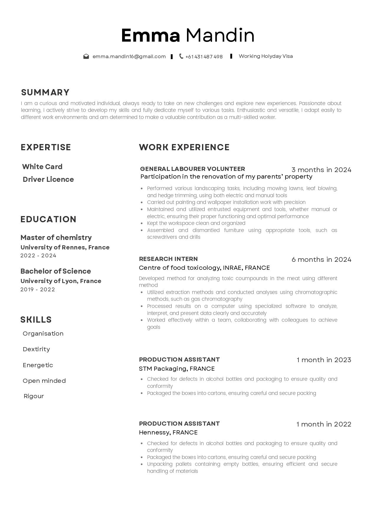 I am currently in Australia on a **Working Holiday Visa**. Curious and motivated, I am always ready to take on new challenges and explore new experiences. Passionate about learning, I constantly strive to develop my skills and fully dedicate myself to all tasks assigned to me. Enthusiastic and versatile, I quickly adapt to different work environments and am determined to make a meaningful contribution as a utility worker.
